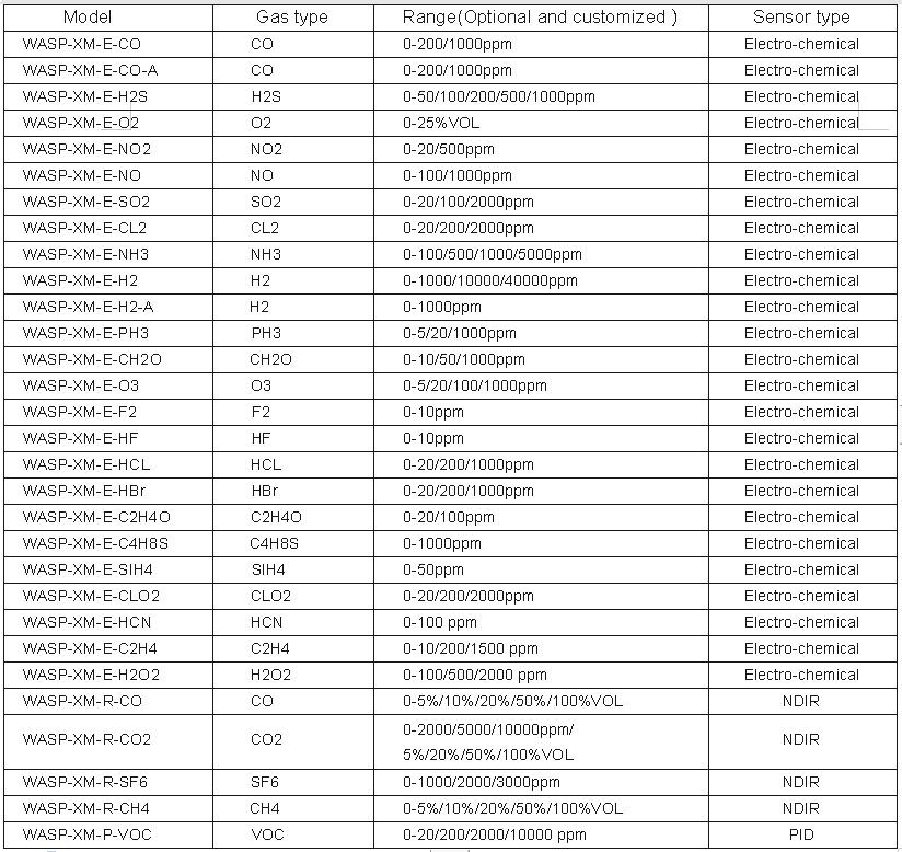 Petroleum, petrochemical, chemical, environmental, paper, paints, coatings, mining, electroplating,textile, coking plants, indoor air quality monitoring, environmental monitoring systems, health monitoring systems. Can be measured gas species: CH2O, TVOC, CO, H2S, NO2, NO, SO2, CL2, NH3, H2, PH3, O3, F2, HF, HCL, HBR, C2H4O, COCL2, SIH4, CLO2, HCN, C2H4, SF6 and combustible gases.