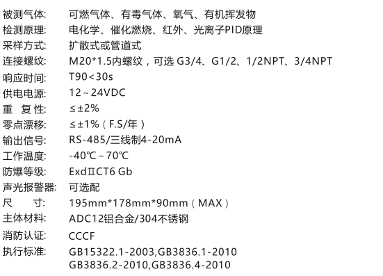 結(jié)構(gòu)模塊化、維護(hù)方便,接線(xiàn)安裝簡(jiǎn)單國(guó)瑞智能傳感器平臺(tái),可即插即用,無(wú)需現(xiàn)場(chǎng)標(biāo)定快速響應(yīng)、測(cè)量精度高,運(yùn)行穩(wěn)定的檢測(cè)儀器通過(guò)防爆認(rèn)證、防護(hù)等級(jí)IP65、防腐蝕性高、抗電磁干擾豐富的傳感器量程選擇,可以滿(mǎn)足客戶(hù)的要求智能傳感器平臺(tái),可即插即用,離線(xiàn)標(biāo)定LCD實(shí)時(shí)顯示氣體濃度,有儀器狀態(tài),故障和通訊異常提示功能可設(shè)置高低報(bào)警點(diǎn),兩級(jí)聲光報(bào)警兩路繼電器可以控制外圍設(shè)備(如風(fēng)機(jī)和聲光報(bào)警器)動(dòng)作產(chǎn)品選擇材質(zhì)優(yōu)秀,具有良好的密封性,防腐性,防爆和抗磁干擾強(qiáng)儀表具用4-20MA輸出與RS-485輸出可以與GRI-8000系列和GRI-9800系列報(bào)警主機(jī)組網(wǎng)使用可以與GRI-9802單點(diǎn)報(bào)警主機(jī)組網(wǎng),每點(diǎn)匹配,點(diǎn)點(diǎn)組合。